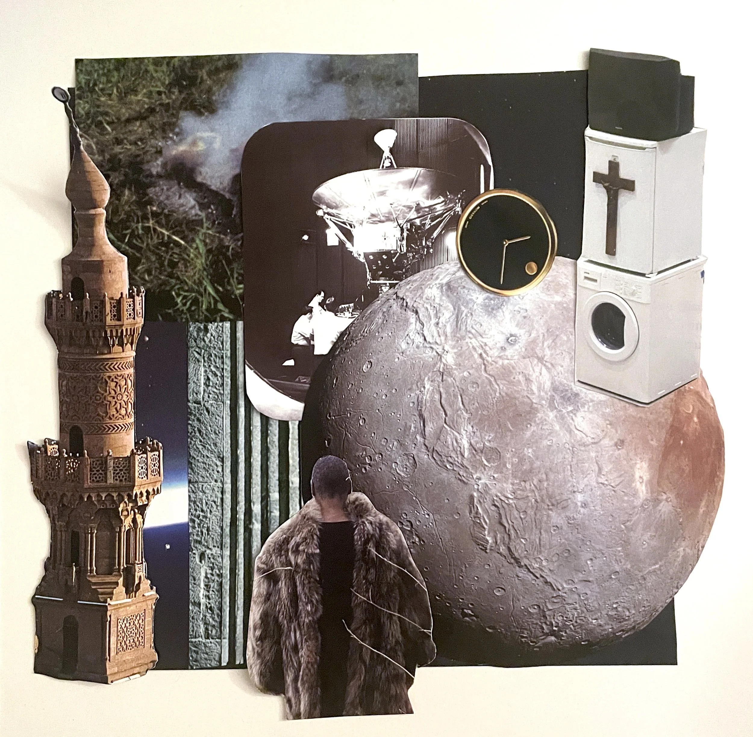 For this exhibition, I contributed one collage from a series titled “Sacred. Secular. Spirituality.” This collage is a reflection on what it has meant, physically and emotionally, to decolonize my spirituality, learning to embody “an otherwise heaven” here on Earth. Exploring diasporic movement traditions and divination systems from West Africa to the U.S., this collage depicts the practices and places where I find bliss; it is a record of an embodied shift in how I understand freedom. Using recycled magazines, thrifted books, old newspapers, found materials, and poster-printed images, I used a variety of paper-based materials to create a dimensionality, vibrancy, and harmony that reflects how I picture an anti-colonial afterlife.